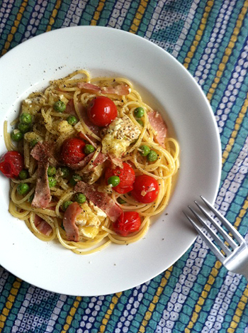 〜グリーンピースとプチトマト、カマンベールチーズのパスタ〜