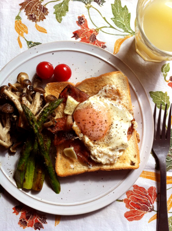 【作り方】フライパンにオリーブオイルを少しとベーコンを入れて焼き、油が温まったらアスパラガスとしめじも一緒に焼く。野菜が焼けたら取り出して塩と黒胡椒を削る。ベーコンの入ったフライパンに卵を割り入れてベーコンエッグにする。トーストにベーコンエッグをのせ、ところどころにバターと塩を散らし、黒胡椒を削る。プチトマトを添える。
