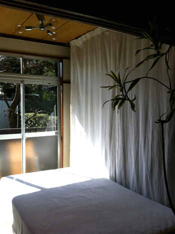 ひとつの壁面に2つの素材があると、それだけで少し空間が狭く感じられる気がする。それに、実はこの部屋の壁に貼られている白いクロスの素材があまり好きじゃない。やっぱり天井からのカーテンがいいな。