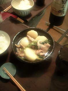 そして1時間程?経った頃、カブと豚バラ肉を白味噌でコトコトと煮込んだお料理と、けんくん入魂の、本当にぴかぴかツヤツヤ、ふっくらと炊き上げた白米を振る舞ってくれた。