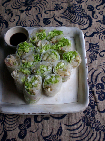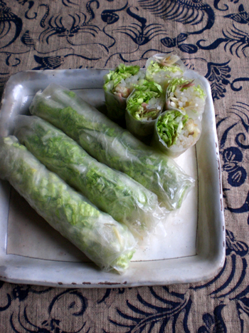 しゃきしゃきの白菜とさっと茹でたもやし、そして香りのアクセントに茗荷をいれた生春巻きをつくりました。美味しかった〜!ご馳走さまでした♪^人^