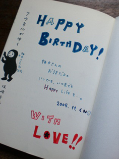 ぱらりとめくると、そこにはもとの字(黒)に加え、くみちゃんの字(赤&青)で誕生日のメッセージが。