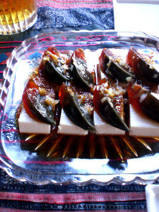 これは豆腐とピータンを切って重ねて、手づくりのタレと微塵切りの葱(または白髪葱)をのせるだけ、という簡単レシピながら、個人的にとってもお気に入りの一品。