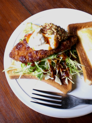 こんがりとパンが焼けたら、チーズがのっていない1枚に水分が染みない様マヨネーズを薄く薄く塗り、水気をしっかりと切った野菜、フライ、ソース、マヨネーズ、粒マスタードをたっぷりとのせれば出来上がり。
