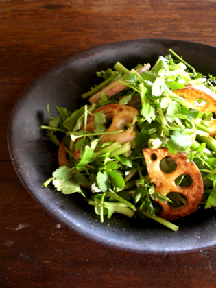 3)せりと焼いた蓮根を器に盛り、[A]をかける。お好みで花椒をふりよく混ぜて頂く。