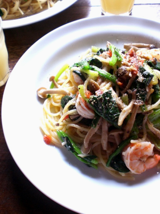 海老、ほうれん草、トマト、ドライトマト、しめじ等々、いろいろ入る具沢山パスタですが、それぞれの素材がお互いを引き立て合う、お気に入りの一皿に仕上がりました。