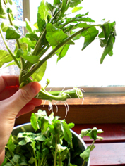 memo:しんなりとした葉ものは、半日くらい水につけておくととっても元気になります。一日以上おく場合は途中で水を新しくします。十分に水分をすってばりんばりんになったら、保存する場合は湿らせたペーパーでくるみ、乾かないようにビニールや容器に入れて冷蔵庫へ。