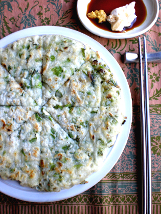 3)オリーブオイルを熱したフライパンに流し入れ、中火で両面をこんがりと焼き、最後にオイルを回し入れてカリッとさせたら出来上がり。からし、マヨネーズ、醤油を添えて頂く。