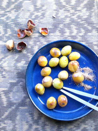 弾けた殻で鍋やフライパンが傷むことがあるので、テフロン加工のものを使う場合は、古くなったものを使うのをおすすめします。殻を割るのは案外大変。銀杏割りがなくても、ペンチやキッチンばさみの持ち手の内側に挟んで割るとらくちんです。薄皮は冷めると取り除きにくくなるとも言われますが、多少ついていても気にせず食べてしまいます。宴のときなど、たくさんの殻を割るのが大変なときには、炒ったものを殻ごと花椒塩を添えて出し、食べるひとがその都度割っても。