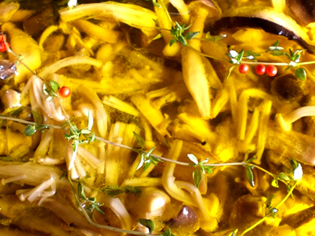 2)ふつふつと煮立って来るころ、きのこがオイルに浸かる状態で、