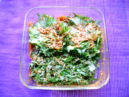 作り方:1)大葉は洗ったあと水気をしっかりと除き、半量は軸のみを除いてそのまま、