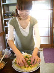 3)器にきゅうり、タレ、海苔、マグロを盛りつける