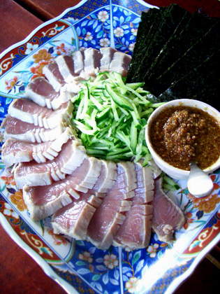 そこのメニューのひとつに、炙ったマグロをきゅうりと白髪葱と一緒に韓国海苔で巻いて、手作りのタレで食べるというものがあり、何年か前にふと思いだして作ってみようと真似っこしてみた。