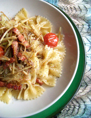 memo:ファルファッレはショートパスタの一種。その形が示すように「蝶」という意味だそう。はじの方と真ん中とで食感がかなり違うので、茹で加減はまるごとひとつ食べてみて確かめます。クリーム系のソースと絡めて軽く煮詰めるような場合は、その分少し固めに茹で上げますが、今回は茹でたあと、フライパンでの加熱は殆ど無いので、ほぼ食べごろの状態まで茹でてしまいます。うどの加熱などはそれほど時間もかからないので、パスタを茹で始めてからベーコンの加熱をスタートさせるくらいのタイミングでよいと思います。味付けの際の塩分量は、ベーコンの塩気もパスタの塩気もあるので、始めにあまり入れすぎず、味をみて足りなければ加えて仕上げます。今回は主食として頂きましたが、なにか他のお料理の付け合わせにしても良さそう。