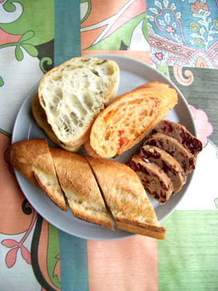 パンは4種類あって、トマトを仕込み水につかったものや、生バジルを練り込んだもの、プレーンのバケットに、ぎっしりとクランベリーの入ったものと盛りだくさん。