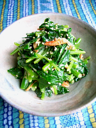 桜えびが入っていて、マヨネーズ風味で、葉のほうは天ぷらにたくさん使うからなのか、どちらかというと茎の部分がメインで和えてあって、そのポキポキと程よい歯ごたえも、茎そのもの味も本当に美味しくて大好き♪