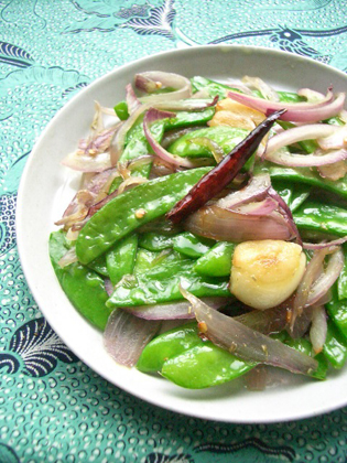 作り方:1)絹さやは水に放しパリッとさせ、炒める直前に筋を除き水気をきっておく