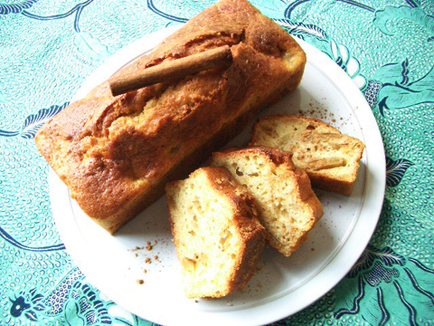 memo:林檎煮の代わりにフルーツの缶詰や市販のコンポート、食感のあるジャムなどでアレンジしても。今回はパウンド型を使いましたが、丸型で焼くなら6号くらいが丁度よい分量です。四角い型でもよいし、カップケーキの型に流して焼き上げてもokです。(お皿の上の粉はシナモンパウダーです。※分量外)