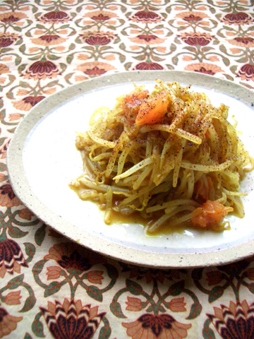 memo:もやしは意外と早く火が通ります。シャキシャキとした歯ごたえが残るよう、炒め過ぎには注意。水っぽくなるのを防ぐには強火で手早く、がポイントですが、一度蒸し焼きにした(または茹でた)もやしを使うのもよいと思います。