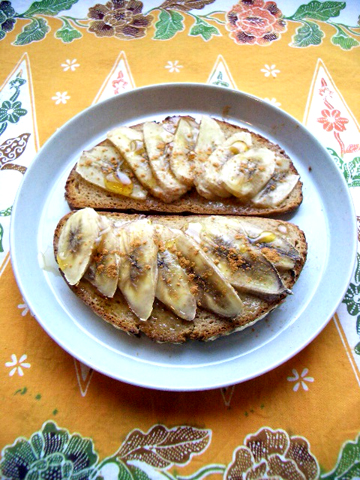 パンにマンゴースプレッドを塗り、バナナを重ねる