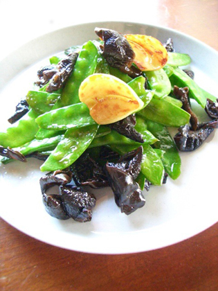2)強火にし、絹さやを加えてさっと炒め、全体に油が回ったらきくらげを加える