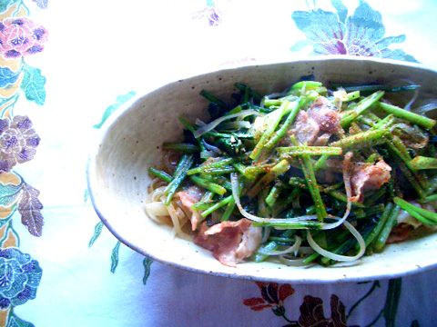 中途半端に余っていたフォーと、たっぷりのカブの葉とベーコンの炒め物を作る。