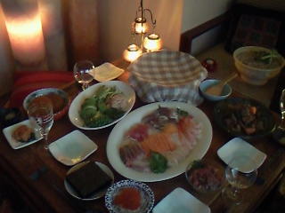 朝仕入れたという新鮮なネタがいっぱいの、とっても豪勢な手巻き寿司や、五香粉の香りが効いた筑前煮、いい〜色に煮込んだ大根煮、そしてお吸い物。。
