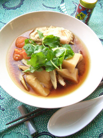 和風出汁で牛蒡を煮て味噌を溶いたところに加え、スープ風の一品に。