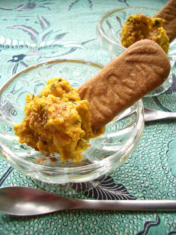 作り方:1)電子レンジで柔らかくしたかぼちゃは、皮ごとマッシャーでよく潰し、