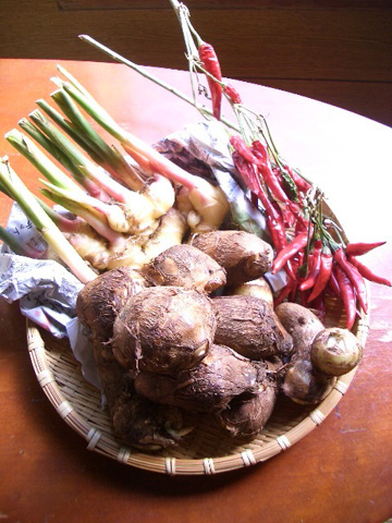 畑から持ってきたの、というその中身は、とっても美味しそうな里芋と生姜、そして数日干しておいてくれた赤唐辛子だった。