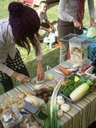 まんなかには大きな敷物を敷いて、青空食堂の出来上がり。