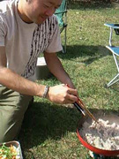 みんなで飲んで食べて楽しく過ごそうと、炭をおこし、火を焚いてせっせと下ごしらえ。
