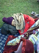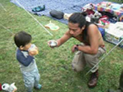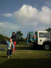 お昼を食べつつビールを飲んだり昼寝をしたりしてみんなでゆったりと過ごしていると、最後の一台、M家の「ハチくん」「タケちゃん」そして二歳の「蔵(くら)」が到着!この時点で既に空き缶の数は凄かったらしい(by.タケちゃん)。。さておき!これで今日のメンバーは揃った。彼らの登場で敷物やテーブルなどが増え、更なる充実の家族村が出来上がった。