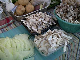 たくさんのきのこをほぐし、玉葱、人参、じゃがいも、にんにくを切る。