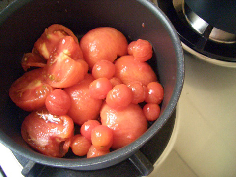 オイルも塩も入れないで、材料はトマトとにんにくとローリエだけ。