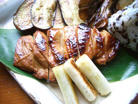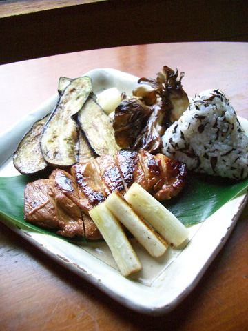 しっかりと味の染み込んだお肉を色よく焼き、舞茸や葱、茄子なども焼いて添えました。