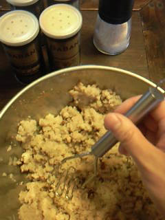 作り方:1)柔らかくふかしたじゃがいもの皮を熱いうちにむき、マッシャーで粗く潰したら