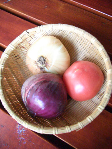 無農薬のトマト、玉葱、紫玉葱。どの子もみんなぴかぴかしていてとっても元気だった。