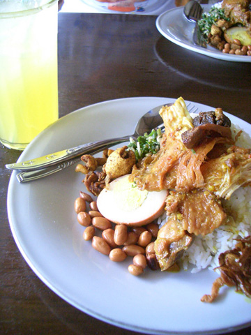 薄暗く(あちらでは普通)、ツーリストの女性がひとりで入るにはちょっと躊躇しそうな佇まいでしたが、あたしはこういうところはへいちゃら。竹の柱がなんだかいいなあ、と思いながら、おすすめだというのでインドネシア風炒飯「ナシゴレン」を頂きました。
