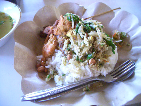 写真はそんなワルンでの一皿で、ごはんにいろいろな具材がのったナシチャンプル。