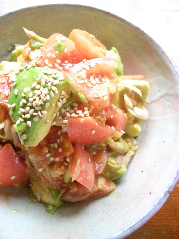 作り方:1)アボカドとトマトは調味料を合わせておいたボウルにいれ、調味料を絡める