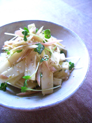 作り方:1)うどは水気を除き短冊切りにし、柚子胡椒と醤油を合わせたボウルにいれ、